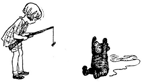 Christopher Robin gave a deep sigh, picked his Bear up by the leg, and walked off to the door, trailing Pooh behind him. At the door he turned and said, "Coming to see me have my bath?"