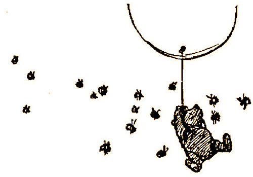 Well, you both went out with the blue balloon, and you took your gun with you, just in case, as you always did, and Winnie-the-Pooh went to a very muddy place that he knew of, and rolled and rolled until he was black all over; and then, when the balloon was blown up as big as big, and you and Pooh were both holding on to the string, you let go suddenly, and Pooh Bear floated gracefully up into the sky, and stayed there—level with the top of the tree and about twenty feet away from it.