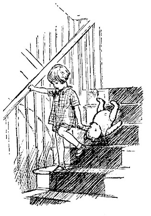 Here is Edward Bear, coming downstairs now, bump, bump, bump, on the back of his head, behind Christopher Robin. It is, as far as he knows, the only way of coming downstairs, but sometimes he feels that there really is another way, if only he could stop bumping for a moment and think of it.